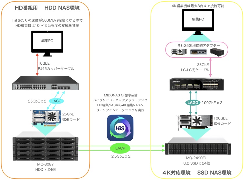 HD番組編集用に大容量のHDD(現時点では最大20TB)使用のNASを使用し、4K編集用のNASはデータ読み取り速度が要求されるのでU.2規格のSSDを使用したNASを使用します。エンドユーザーから、「4K編集の機会はあるが、頻度は高くない」との声を反映し、HD編集NASから4K編集NASへHD素材を自動的にシンクロさせるために標準装備のHBS3(ハイブリッド・バックアップ・シンク3)機能を使用する事で、素材データのNAS間のデータコピーを自動化できます。この機能はNAS全体はもちろん、個々のフォルダ単位でデータコピーをさせることが可能ですので、不必要な素材データで4K用NASの容量浪費を防止できます。
