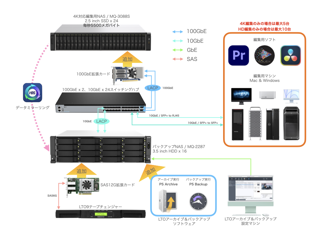 (1)高速NASによるデータ共有しての4K/HD動画編集 (2)編集用マシンはWindowsとMac混在が可能 (3)編集ソフトはPremiere Pro、EDIUS、DaVinciResolveが使用可能 (4)スイッチングハブと高速NASは100ギガビット・イーサネットを2回線束ねての200ギガで接続(5)編集機とハブは10ギガのSFP+でLC-LCケーブルで接続。これにより通信が双方向で行われるためアクセスがより安定し高速に (6)高速NAS内のデータはバックアップ用NASにリアルタイムにデータミラーリング (7)ミラーリング(バックアップ)はNAS標準装備のHBS機能で実行 (8)編集用高速NASがクラッシュした場合はHBSを使用してバックアップNASからデータを復元(9)バックアップNASがクラッシュした場合に備えてLTOテープ・チェンジャーで自動バックアップ(10)LTOへはデータ復元に効率の良いP5 Backupで自動運行 (11)データの可用性を高めるLTOへのアーカイブをP5 Archiveで任意に実行 (12)LTO運行操作は専用のマシンで実行