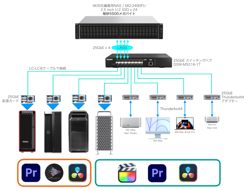 オールフラッシュ構成のMIDONAS Q / MQ-2490FUを使用したシンプルな4Kデータ共有編集環境です。NASには25GbEポートを4系統標準装備。この4系統をリンクアグリゲーションで結束して100GbE化のうえ、QNAP / QSW-M5216-1Tと接続。こうすることでNASの強力なアクセス能力の全てを100GbEの帯域でハブとアクセスが可能になります。各編集機にはLC-LC光ファイバーケーブルを使用し25GbEで接続し通信を完全双方向化することで、NAS内のデータ読み込みを理想的な速度で行えます。QSW-M5216-1Tハブには25GbEポートが16系統ありますが、4K編集機は最大で8系統まで対応できます。